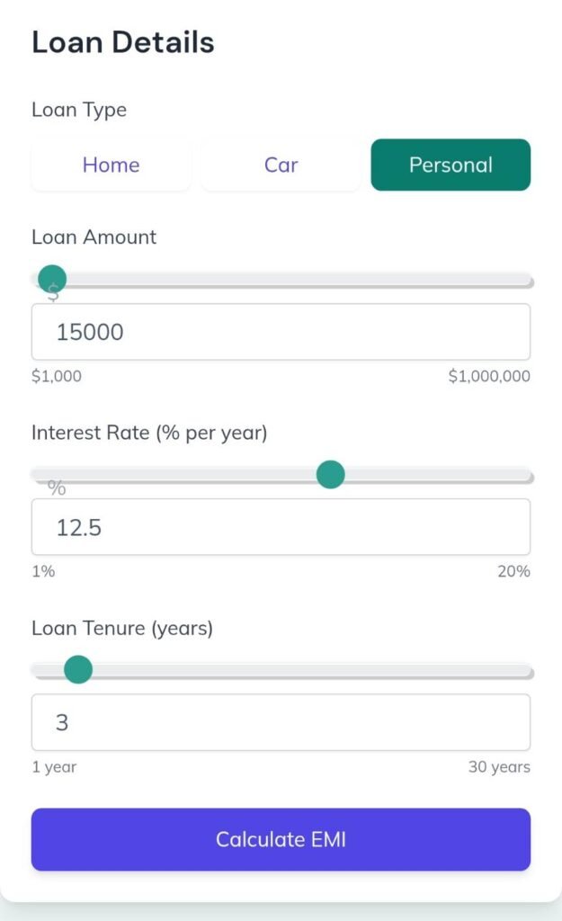 👉 Tip: Adjusting the slider allows you to instantly see how EMI changes with different loan amounts.